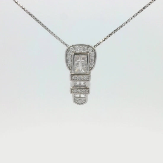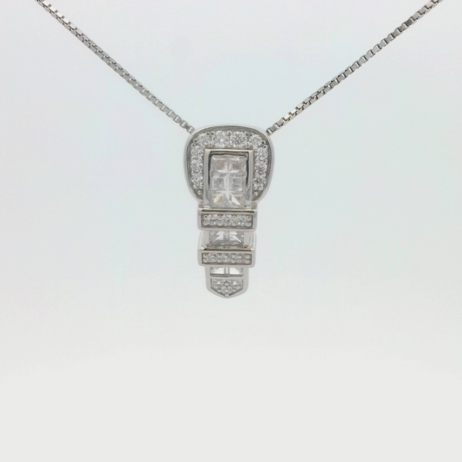 The Kelly Herd Ranger Style Buckle Necklace features a pendant that is finely detailed replicas of a classic three piece western buckle set, enhanced with square CZ stones. Comes with a 16-18" adjustable chain. Sterling Silver.