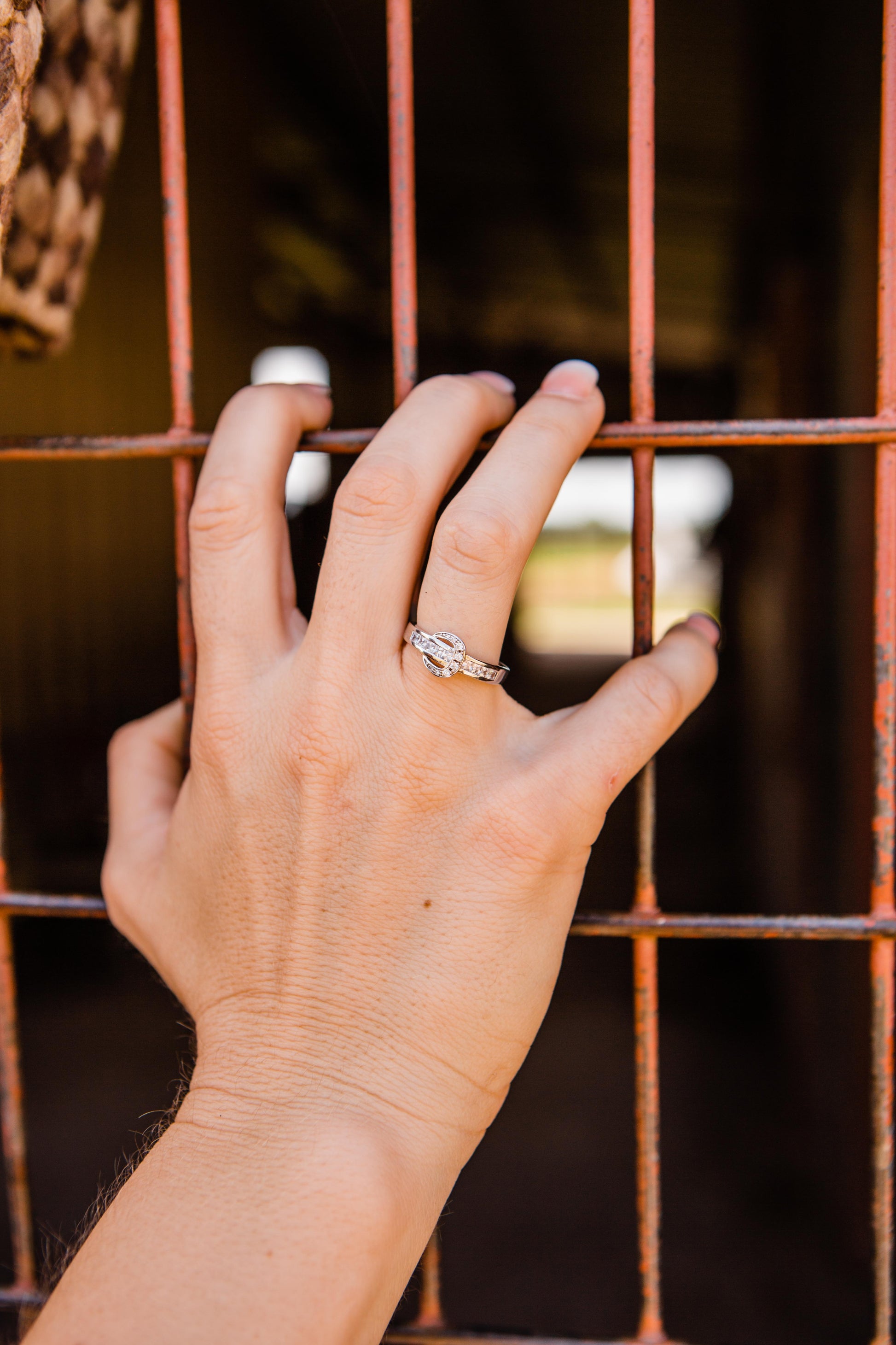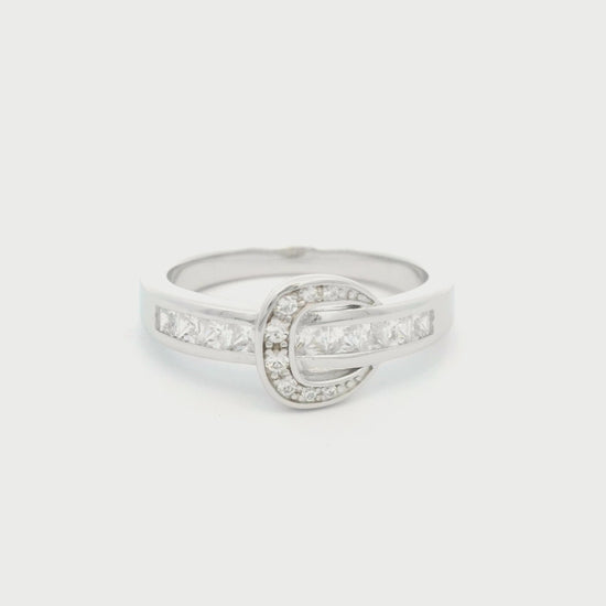 The Kelly Herd Contemporary Buckle Ring is made of sterling silver with clear CZ stones set in a belt and buckle style. It is clean lined and simple; more English show belt than large rodeo buckle.