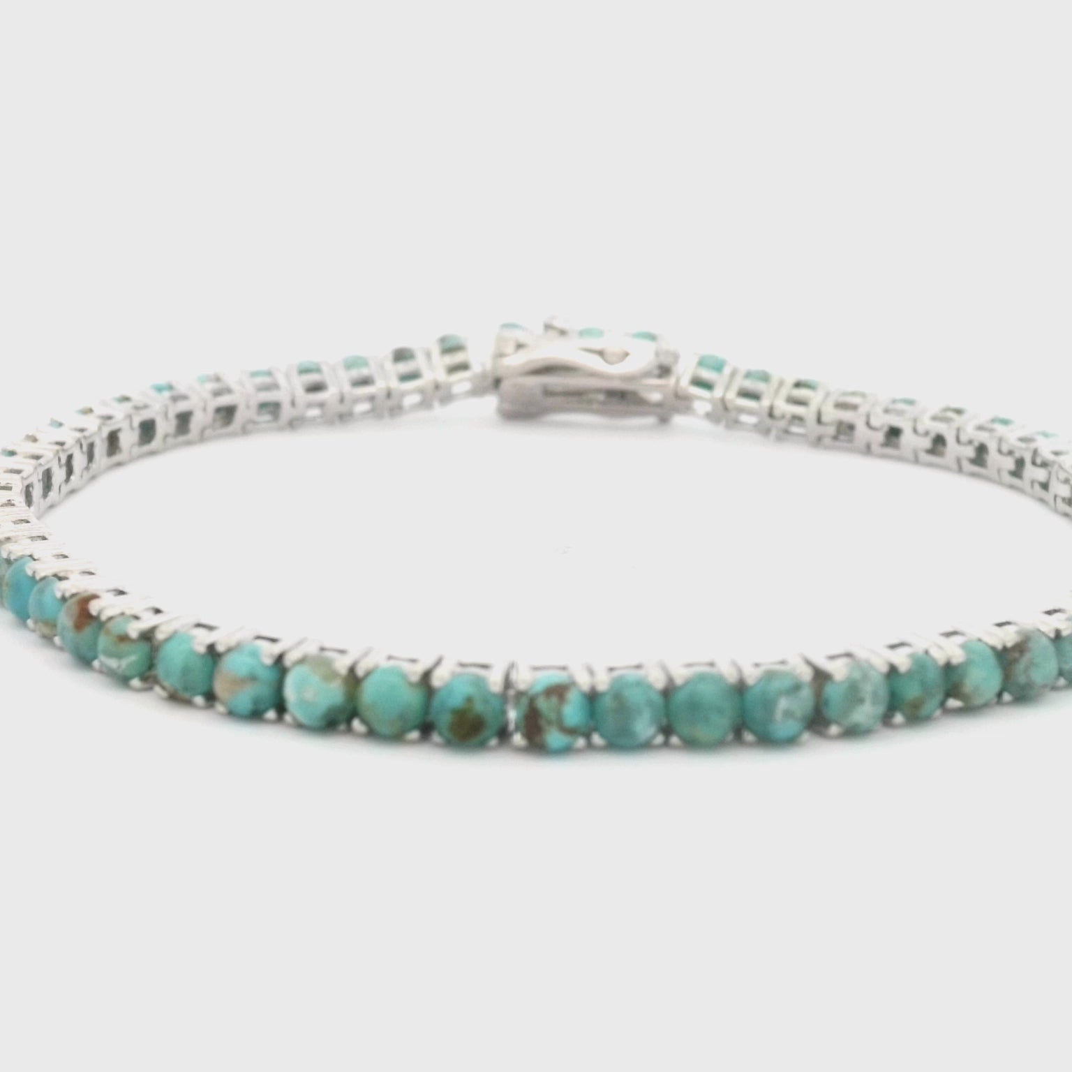 This stunning bracelet features 56 round 3mm Kingman turquoise stones, renowned for their vibrant blue hue and natural beauty. Each stone is carefully set in a sterling silver setting, creating a sleek, elegant design. The 7-inch length ensures a comfortable fit around the wrist, making this bracelet perfect for both everyday wear and special occasions.
