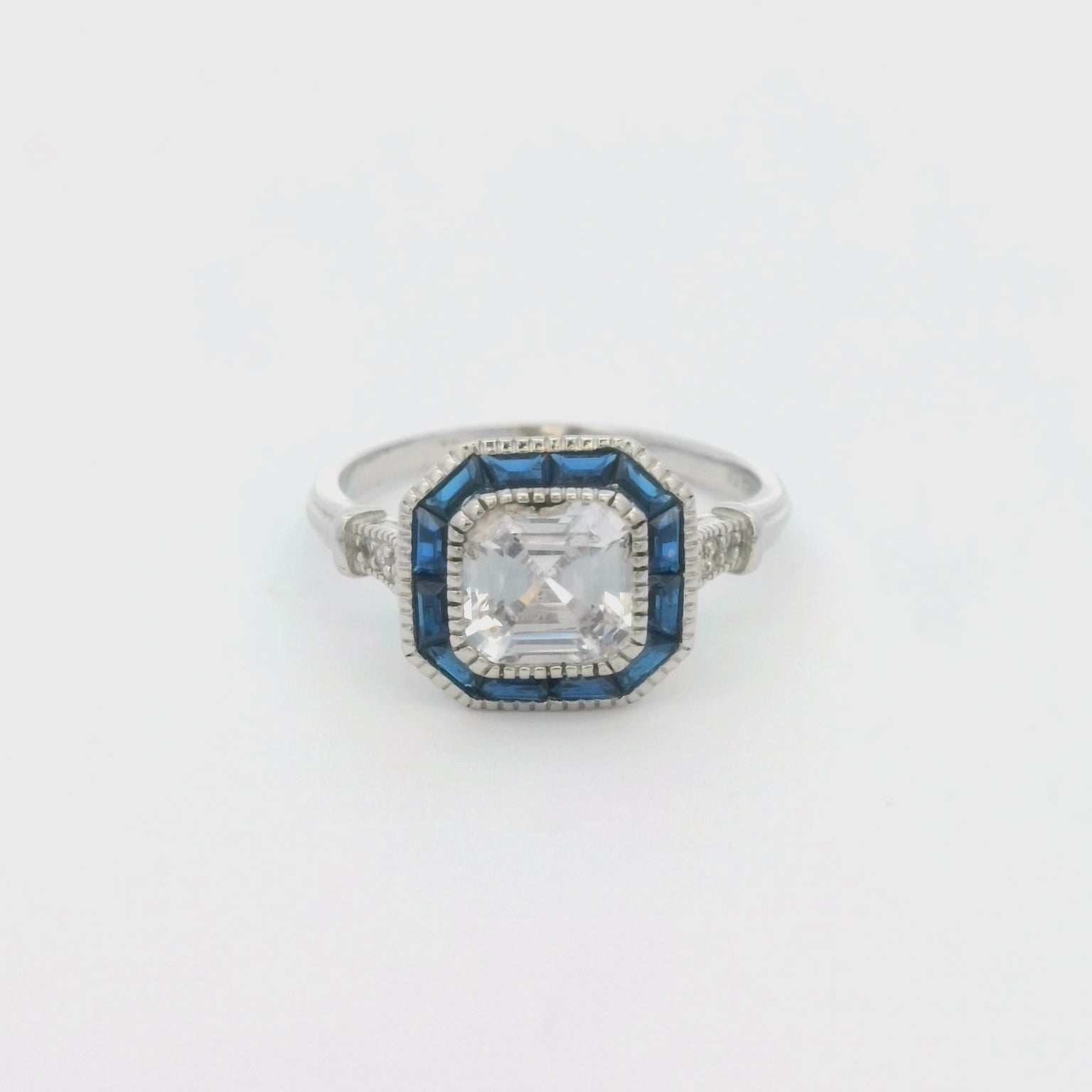 The Kelly Herd Small Asscher Cut/Blue Spinel Ring is just lovely! The modern asscher cut is similar to an emerald cut, but larger step facets, a higher crown, and a smaller table. This combination produces more brilliance. This ring features an asscher cut clear cubic zirconia, surrounded by blue spinel. The intricate designs on sterling silver base give this ring a vintage look.