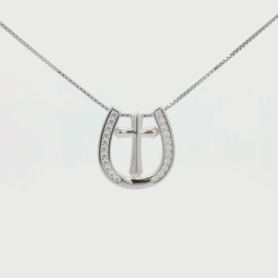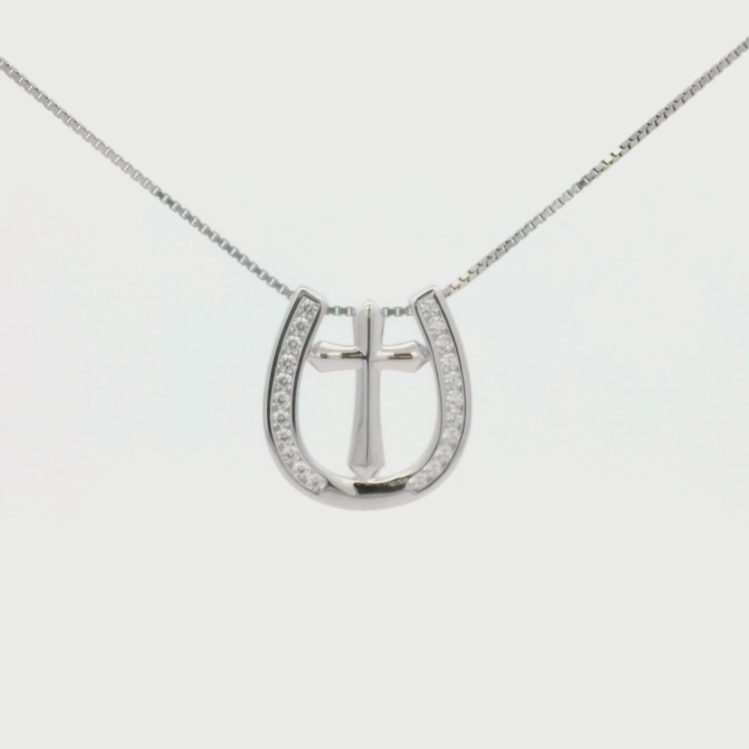 Sometimes all you need is faith and a little luck! The Kelly Herd Horseshoe Cross Necklace represents both. This simple, clean lined pendant has been crafted in sterling silver. The horseshoe is enhanced with clear CZ stones, and the cross is smooth. Comes with a 16-18" adjustable chain.
