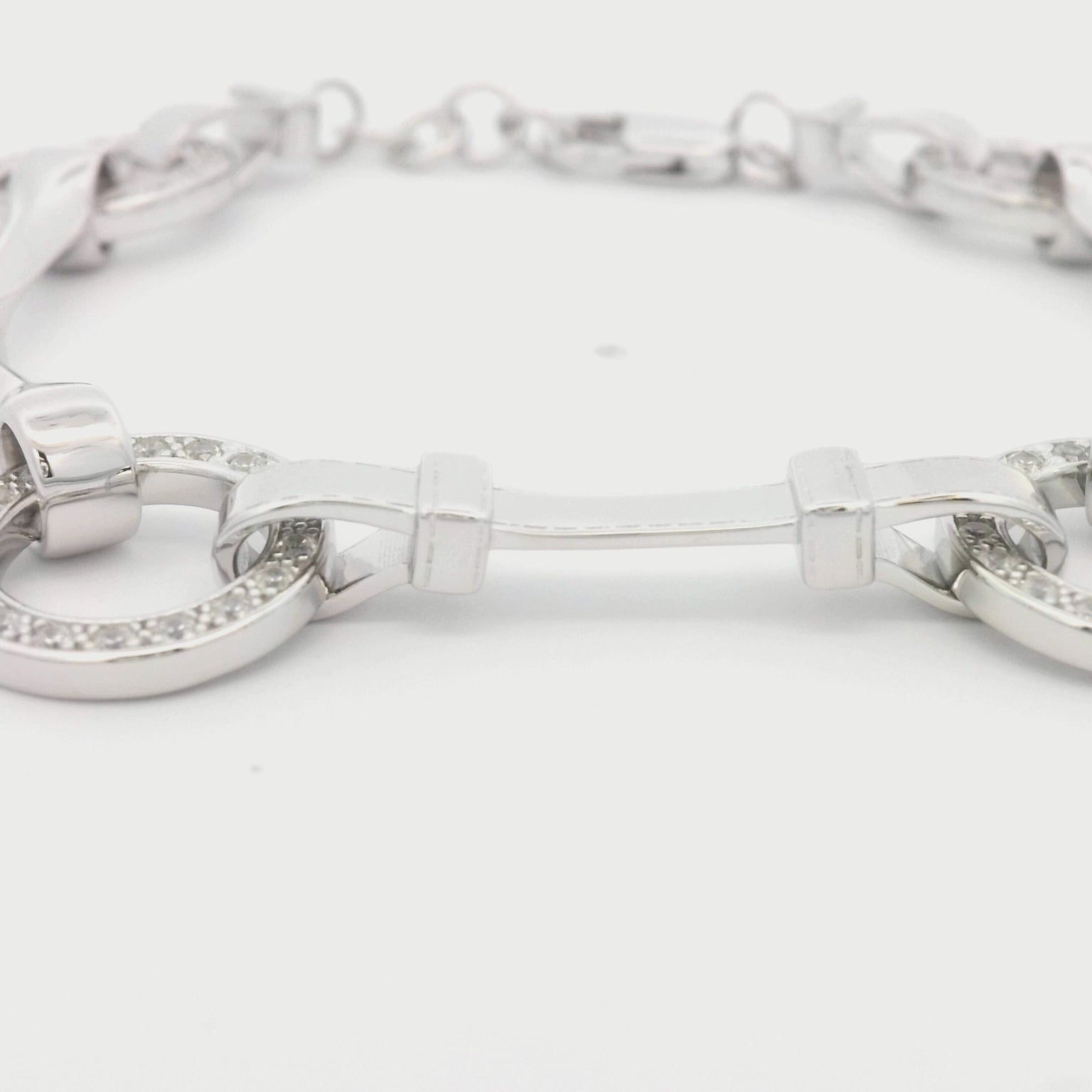 The Kelly Herd Snaffle Bit Bracelet is impeccably designed. You can even see the tiny stitches on the "leather" that connects the bits. Made of sterling silver, and enhanced with CZ.