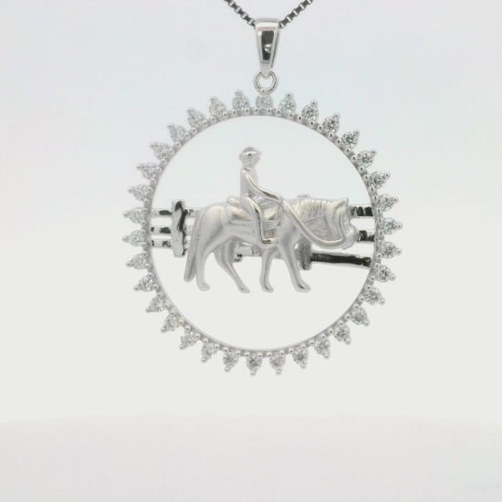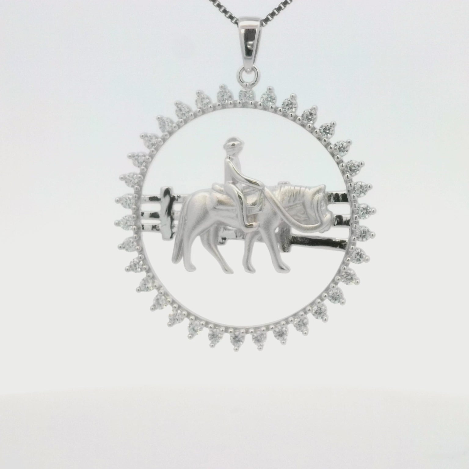 Kelly Herd's Ranch Horse Pendant captures the quieter moments of ranch and farm live. Crafted in sterling silver, and enhanced with CZ stones. Comes with 16-18" adjustable chain.