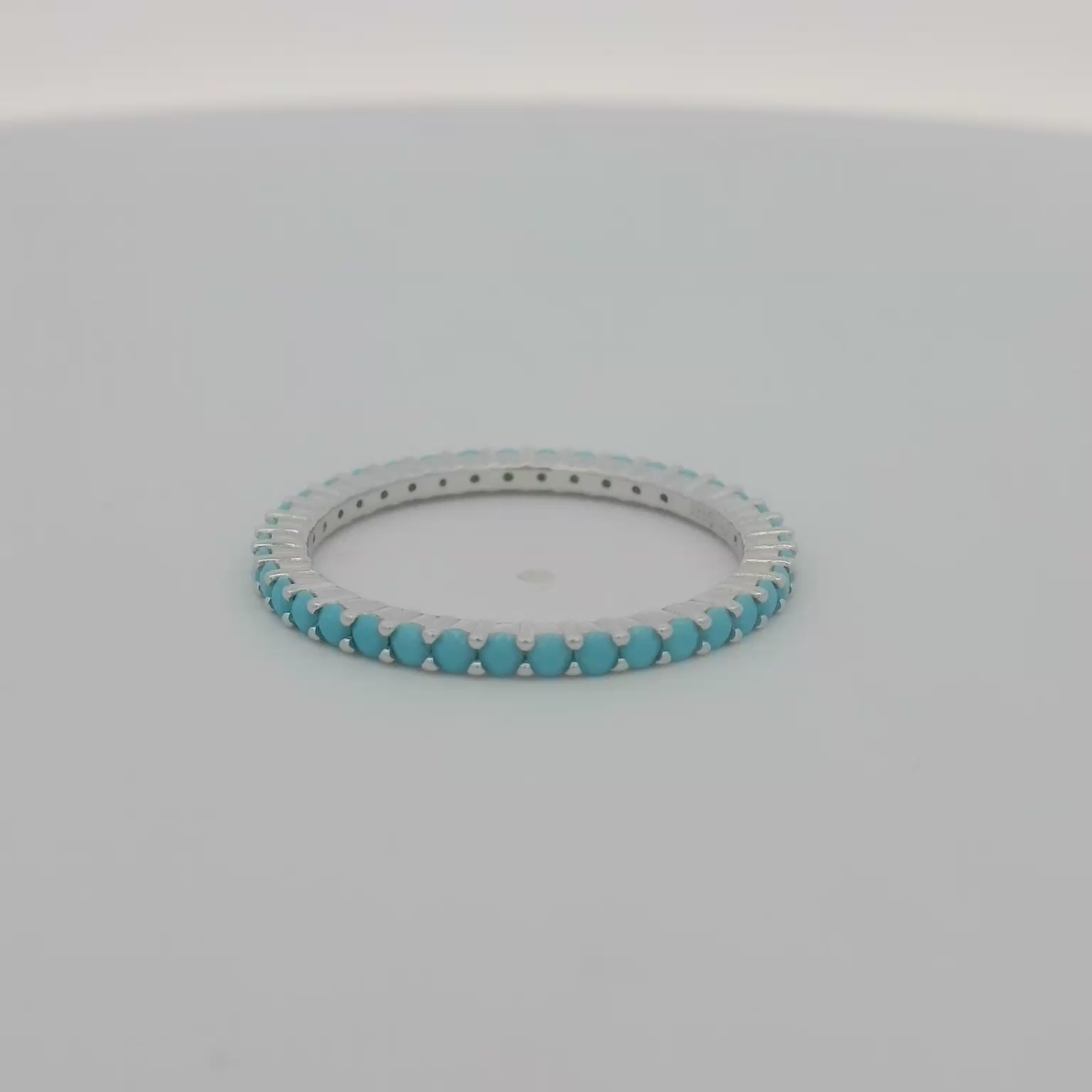 Celebrate timeless elegance with our ladies' sterling silver turquoise anniversary band. This versatile ring features 37 round turquoise stones, each 1mm in size, adding a vibrant touch to its sleek design. Whether worn as a thumb ring or a wedding band, this piece is perfect for everyday wear and complements any outfit.