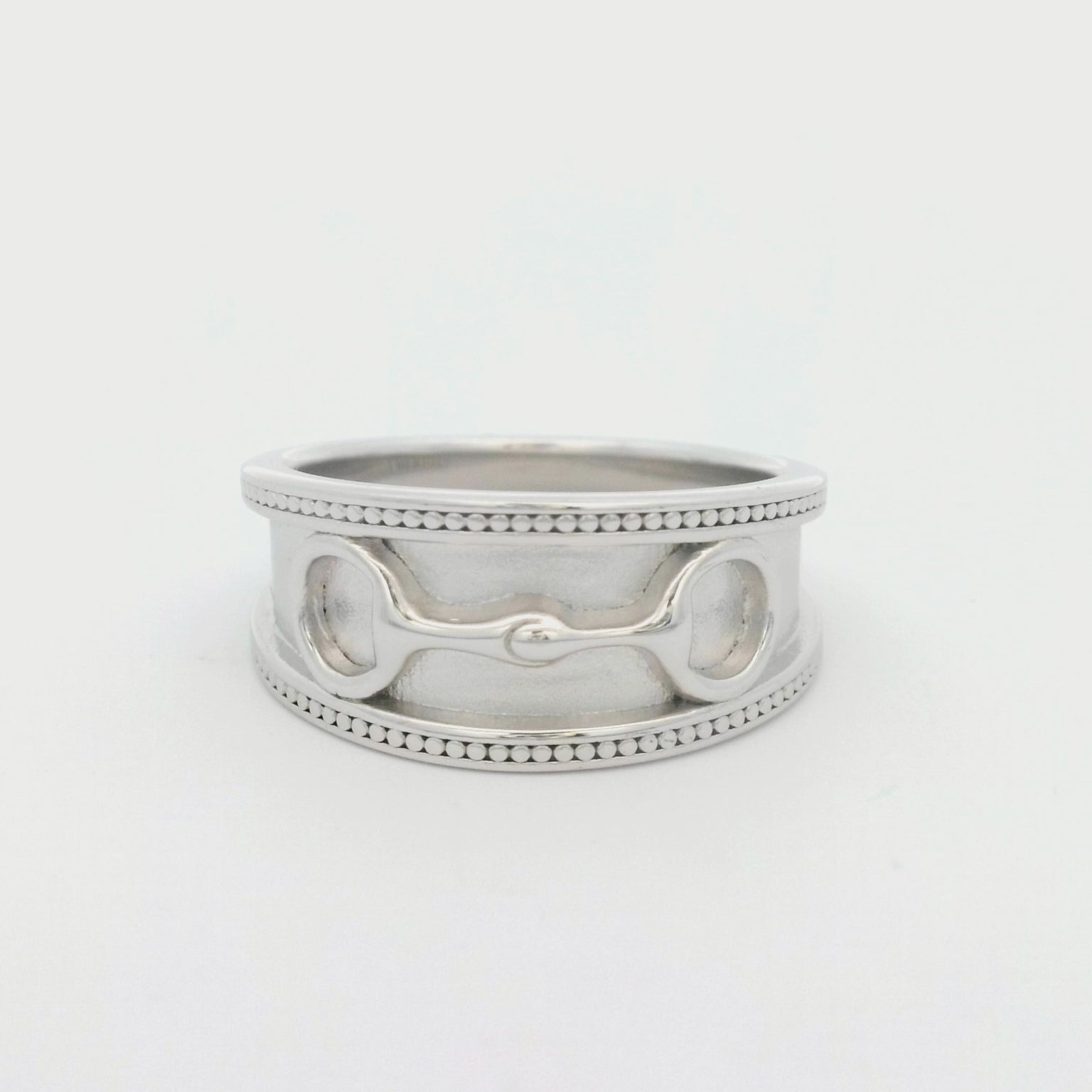 Perfect for the equestrian that prefers a ring without any bling! The Kelly Herd Wide Band Eggbutt Bit Ring features a 9mm wide band of brushed sterling silver with a raised beaded edge. In the center sits a perfectly formed tiny Eggbutt bit.